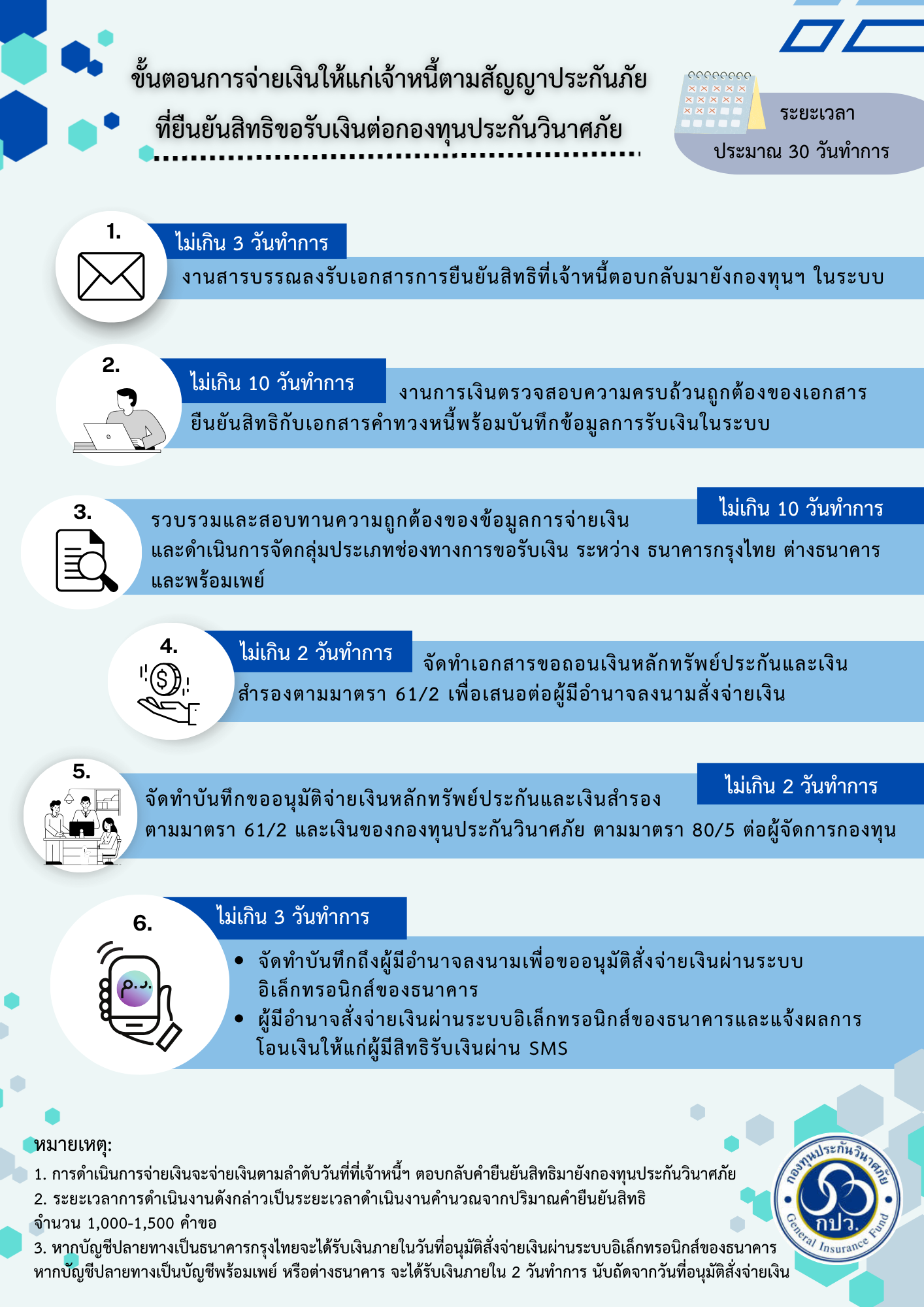 1. การดำเนินการจ่ายเงินจะจ่ายเงินตามลำดับวันที่ที่เจ้าหนี้ฯ ตอบกลับคำยืนยันสิทธิมายังกองทุนประกันวินาศภัย