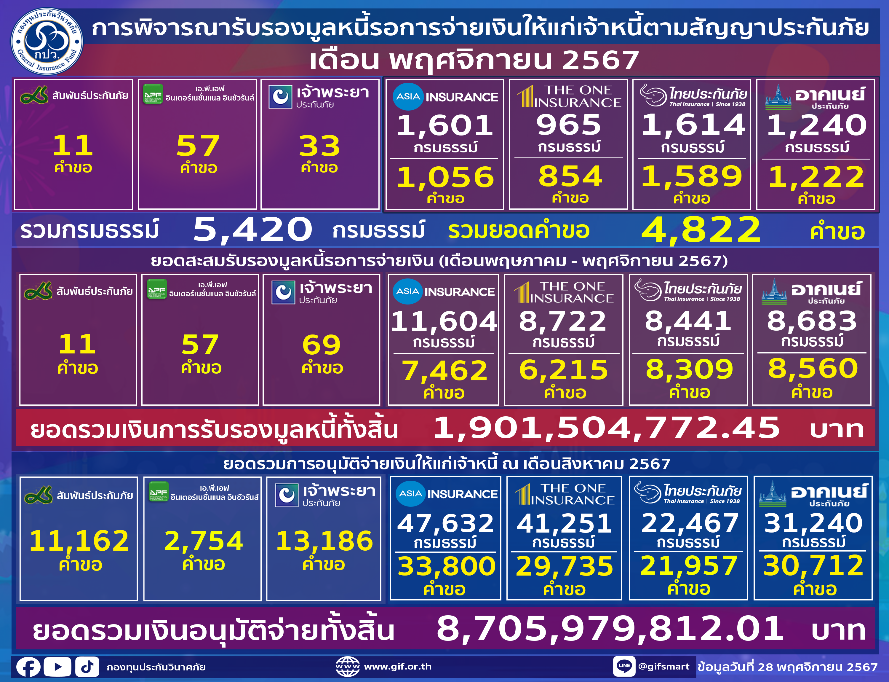 กองทุนประกันวินาศภัย ได้มีการพิจารณารับรองมูลหนี้รอการจ่ายเงินให้แก่เจ้าหนี้ตามสัญญาประกันภัย ประจำเดือนพฤศจิกายน 2567 โดยมีรายชื่อบริษัท ดังนี้