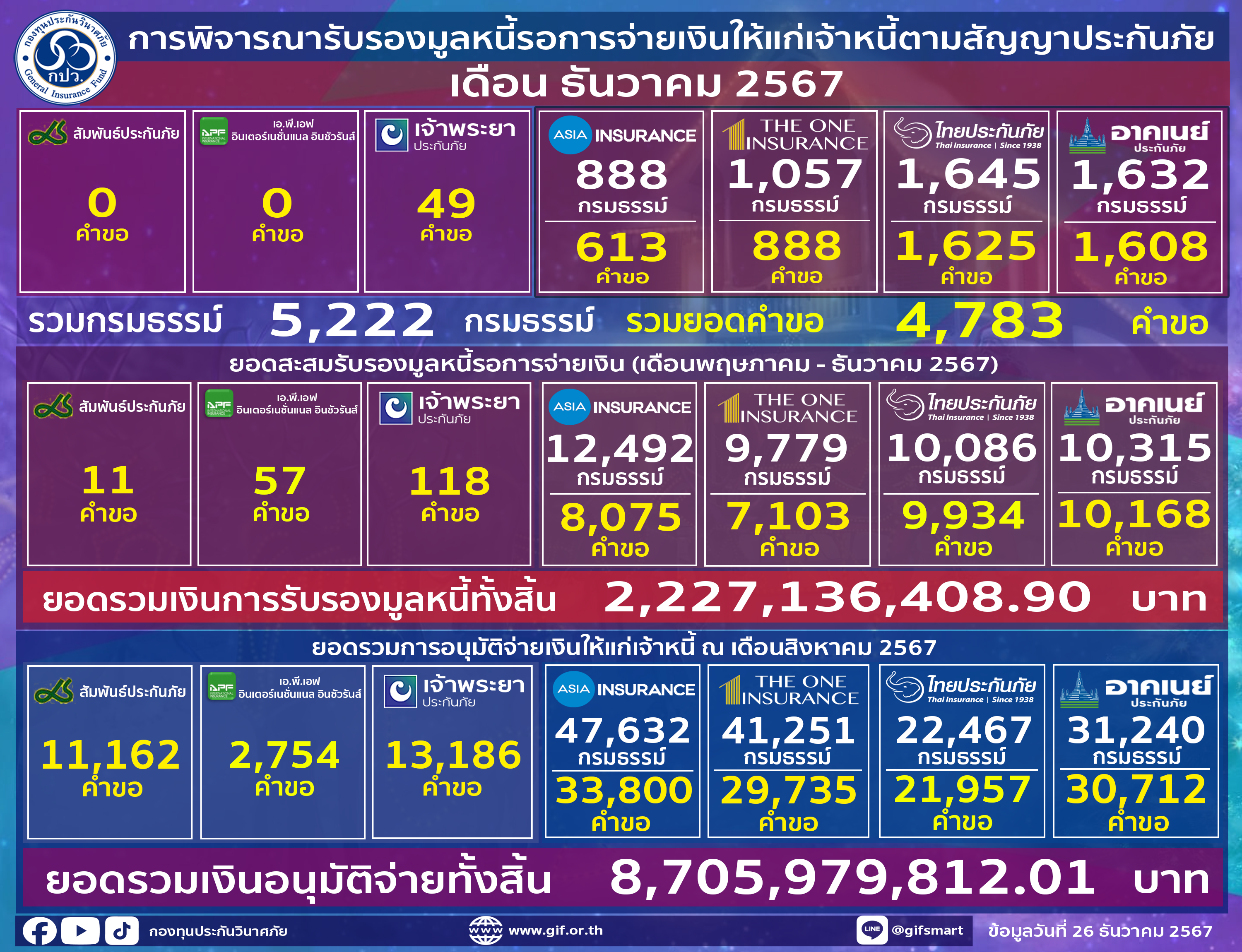 กองทุนประกันวินาศภัย ได้มีการพิจารณารับรองมูลหนี้รอการจ่ายเงินให้แก่เจ้าหนี้ตามสัญญาประกันภัย ประจำเดือนธันวาคม 2567 โดยมีรายชื่อบริษัท ดังนี้